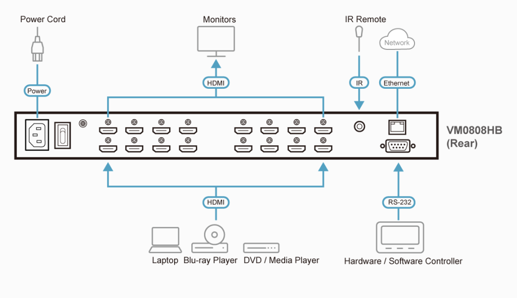 - 1x VM0808HB 8 x 8 True 4K HDMI Matrix Switch